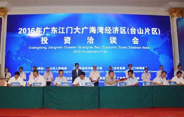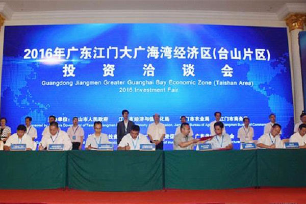 6月28日上午,由台山市人民政府、江门市经济和信息化局、江门市农业局、江门市商务局主办的2016年广东江门大广海湾经济区(台山片区)投资洽谈会在台山市隆重举行,省农业厅黄斌民副厅长出席会议并致辞。本次投资洽谈会共签约32个项目,金额292亿元;其中,广东省农产品加工示范区作为重大项目,分别与两家农产品加工龙头企业进行现场签约。