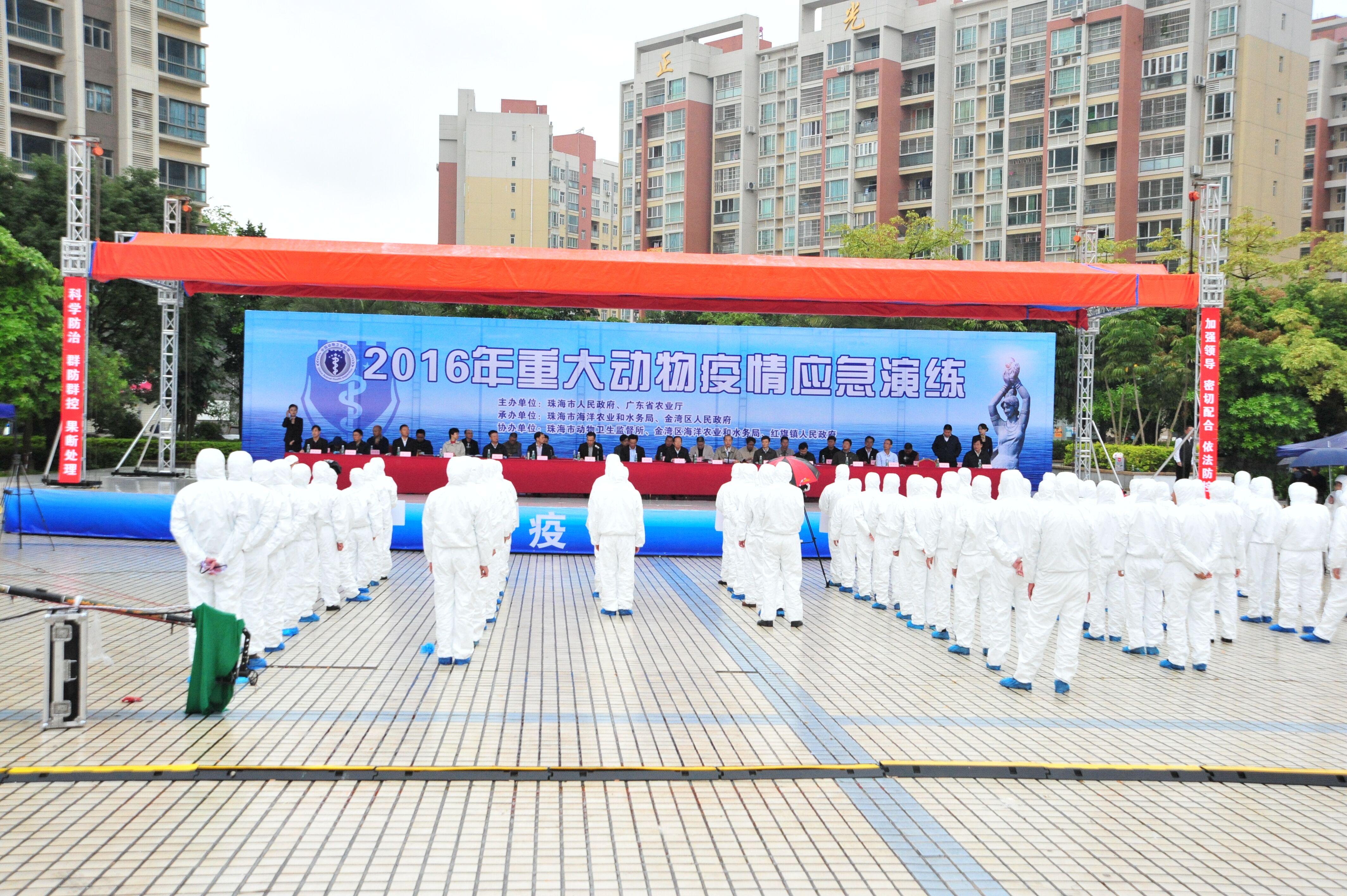 冬季以来,我省进入H7N9流感和H5N1高致病性禽流感等动物疫病高发期,动物疫病防控形势复杂严峻。为进一步规范重大动物疫情应急处置程序,锻炼应急处置队伍,提高应急处置能力,11月10日上午,省农业厅、珠海市人民政府联合在珠海市举行了2016年重大动物疫情应急演练。省农业厅副厅长、省畜牧兽医局局长郑惠典,珠海市人民政府副市长刘嘉文,各地级以上市兽医管理部门负责人、珠海市重大动物疫病防控指挥部成员单位负责人及各区人民政府领导、农牧部门负责人共100多人观摩了演练。