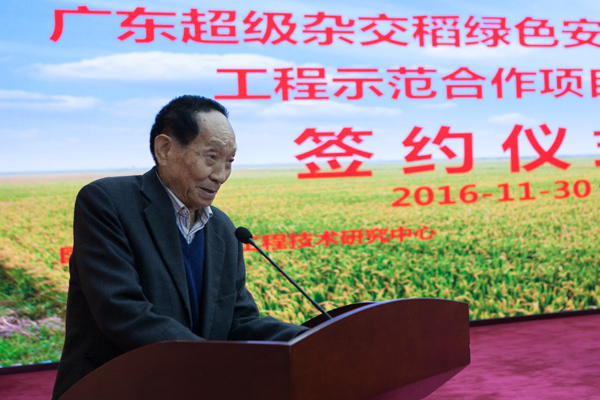 袁隆平院士在致辞中表示,广东是科技强省,也是农业强省,广东的条件适合种植双季稻,双季超级稻年亩产3000斤的梦想就是在广东实现的,希望未来通过合作,再次先期实现单季稻每公顷17吨、双季稻每公顷25吨的目标产量。