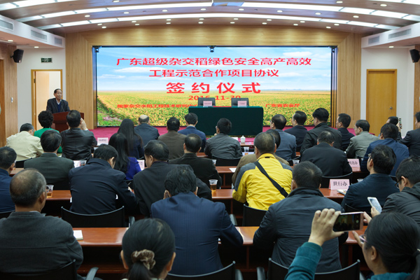 11月30日上午,广东省农业厅与国家杂交水稻工程技术研究中心在广州签约“广东超级杂交稻绿色安全高产高效示范工程合作项目”。广东省农业厅郑伟仪厅长,被誉为“杂交水稻之父”的袁隆平院士,国家杂交水稻工程技术研究中心有关领导及专家,广东省农科院有关领导及专家,华南农业大学有关领导及专家,省农业厅有关处室和事业单位负责同志共60多人参加了签约仪式。郑伟仪厅长向项目组的各位专家颁发了聘书,签约仪式由省农业厅副厅长程萍主持。