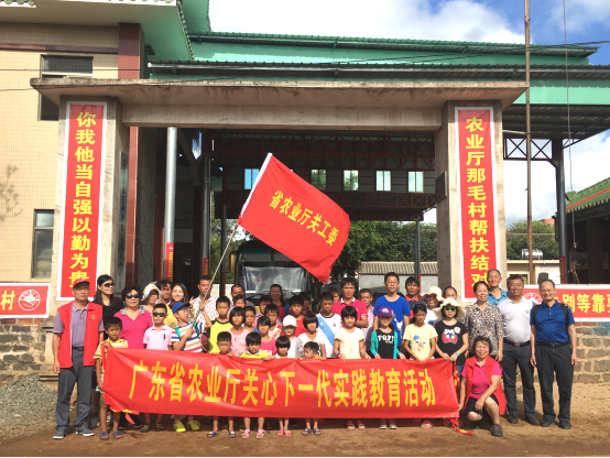 为关心、教育广东省农业厅下一代,让城市孩子体验田间劳动,并慰问省农业厅扶贫点那毛村贫困户,7月16日,厅关心下一代工作委员会在该村开展“广东省农业厅关心下一代实践教育”活动。在厅关工委相关负责同志带队下,7名小孩子及其家长走进那毛村,体验一天的乡村生活。这些小孩子年龄在7到14岁之间,都来自于省农业厅干部职工的家庭。那毛村相关同志为孩子们的到来,安排了形式丰富的活动,主要有认识那毛村小朋友、观摩植保无人机作业、挖番薯比赛、入户做客、慰问贫困户等。