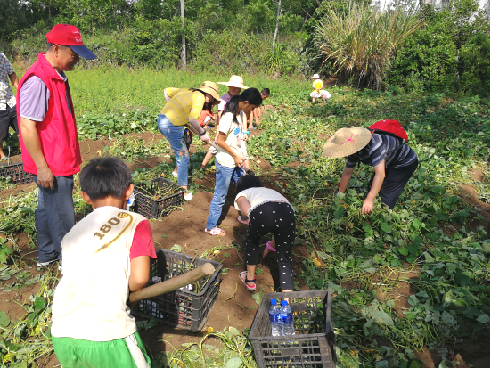 小朋友们的“自来熟”,很快就将活动进程推到了第二项任务——挖番薯比赛。比赛规则是:每个活动小组先在地里挖薯,然后将番薯分类装进包装箱里,在一个小时内装箱总重量最重的胜出。为了制胜,孩子和家长们都挖得很起劲,每个小组各出奇招,整个比赛场面乐趣多多。获得名次的小朋友,奖品是一只金色的“孙悟空”奖杯。其他小朋友则是优秀奖,也能获得一个“小螺号”作为奖品。第二项任务结束后,刚刚好到了中午饭点。于是,小朋友们拿着自己的奖品,高高兴兴地去进行第三项任务——去那毛村小朋友家做客,吃午饭。饭桌上,城市孩子入乡随俗,村里孩子热情大方。让父母们感到高兴的是,小孩子不但自觉把饭碗吃得一干二净,还主动提出收拾碗筷。