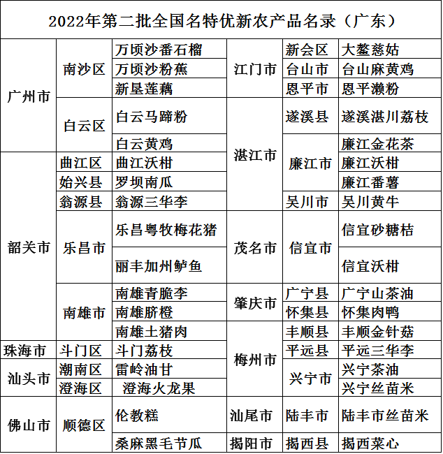 近日,农业农村部农产品质量安全中心公布了2022年第二批全国名特优新农产品名录,377个产品符合收集登录要求,正式纳入“全国名特优新农产品”名录,并核发全国名特优新农产品证书。其中广东有36个产品入选,入选农产品数量位居全国前列,紧随内蒙古和河南之后,涵盖水果、茶叶、蔬菜、水产、畜禽等多个领域。到目前为止,广东共有383个农产品入选全国名特优新农产品名录,数量在全国名列前茅。