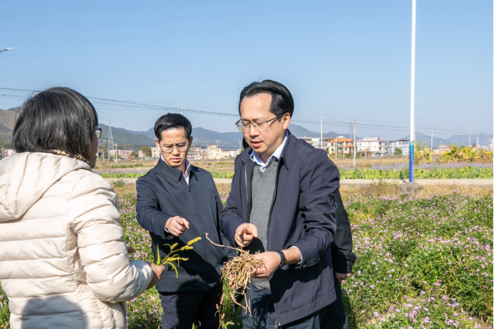 在罗定市罗镜镇石淇湾村、水摆村,调研组成员向当地村委干部、村民询问有关情况,并围绕种植紫云英的技术要点提出建议,强调冬种紫云英绿肥对广东推进农业高质量发展、深入实施“百千万工程”的重要意义。